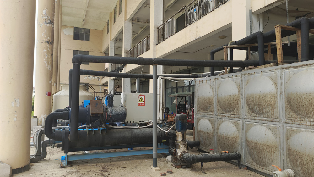5臺80P螺桿冷水機對1個10噸的保溫水箱恒溫,使水箱24小時保持在18.5度,10臺不銹鋼水泵對車間10條鉆石培肓生產恒溫恒壓供水。