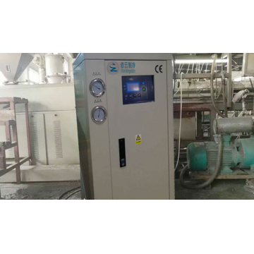 塑膠擠出設備一般都是先通過高溫將物流融化,然后通過擠出模頭將產品擠出成型,因塑膠產品在高溫下是沒有一定的硬度容易變形,所以在產品成型后需要通過冷水讓產品快速定型。在此過程中就會需要用到我們的冷水機,如果沒有冷卻水那么會造成產品的生產效率比較低并且殘次率會偏高。在為塑膠擠出用冷水機配置選型的時候需要特注意,一般的擠出設備都有一個冷卻槽,那么冷水機的配置與我們的標準機會有一定的區別。